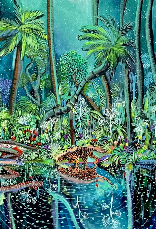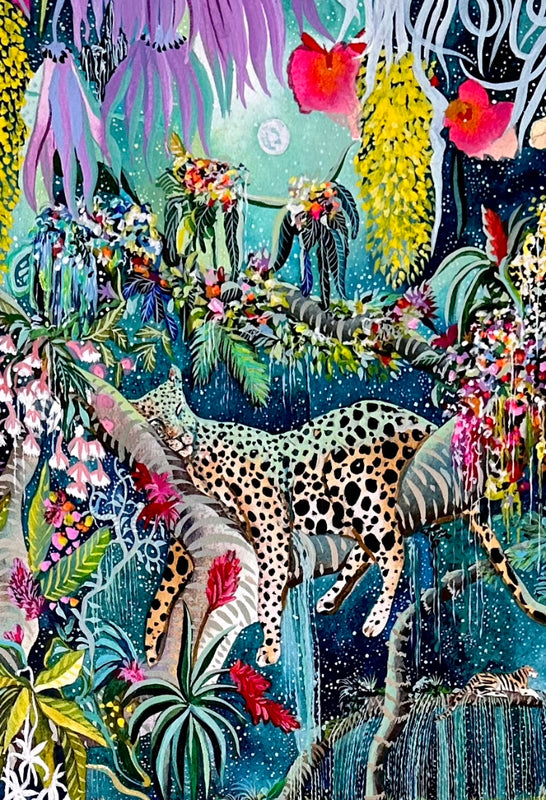 Kate Morgan's dream-like detailed paintings glow with the exotic. Jewel-bright flowers twine with creeping lianas, and her beautiful animals appear serene in the colourful vegetation. Her vision of the jungle is a joy in the beauty and sheer variety of nature...