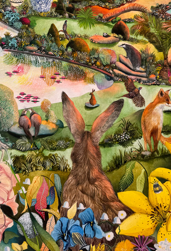 In some of my new pieces, you will discover that I have ‘zoomed out’ in my compositions. Details are slightly smaller and there are more animals, birds and insects to find. I have been fascinated to capture leaves, trees, and foliage in a different way too by painting them from a distance rather than close-up.