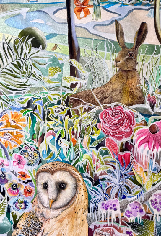 In some of my new pieces, you will discover that I have ‘zoomed out’ in my compositions. Details are slightly smaller and there are more animals, birds and insects to find. I have been fascinated to capture leaves, trees, and foliage in a different way too by painting them from a distance rather than close-up.
